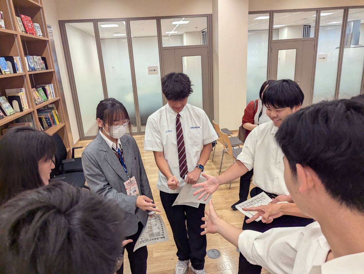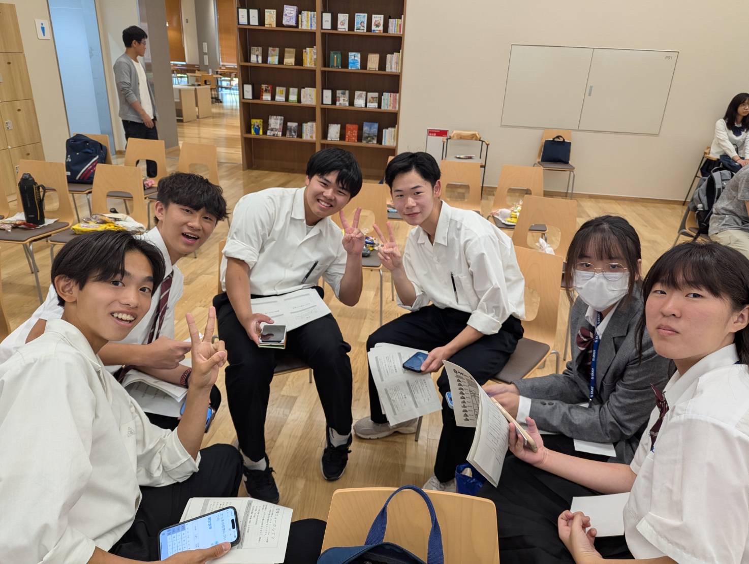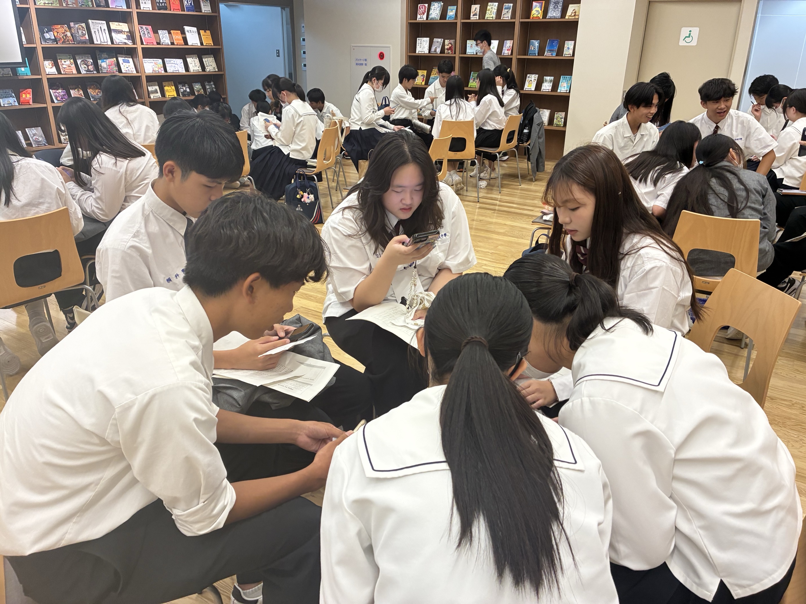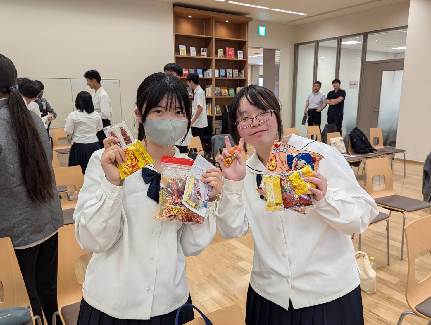 しかし、懸命に英語を話して伝えようとしたり、翻訳アプリを用いることで自分の気持ちを相手に伝えようとしたりと頑張りました。さらに修学旅行生の皆さんから台湾のお菓子を頂き、とても和やかな雰囲気の中で活動を行うことができました。